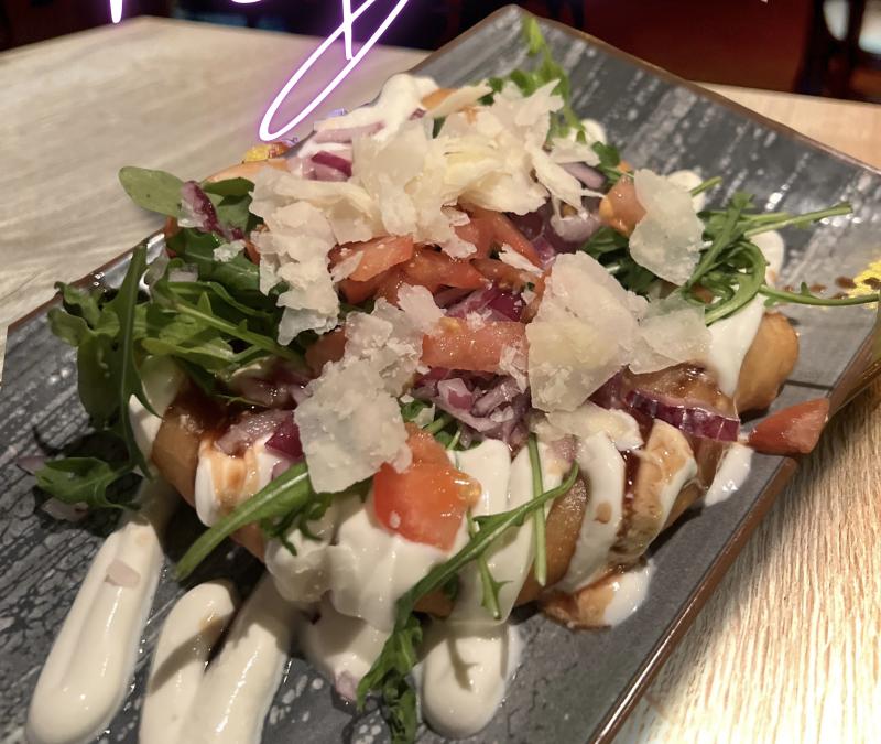 Knusprig Frittiertes Brot mit Soure Cream, Rucola, Tomate & Zwiebel